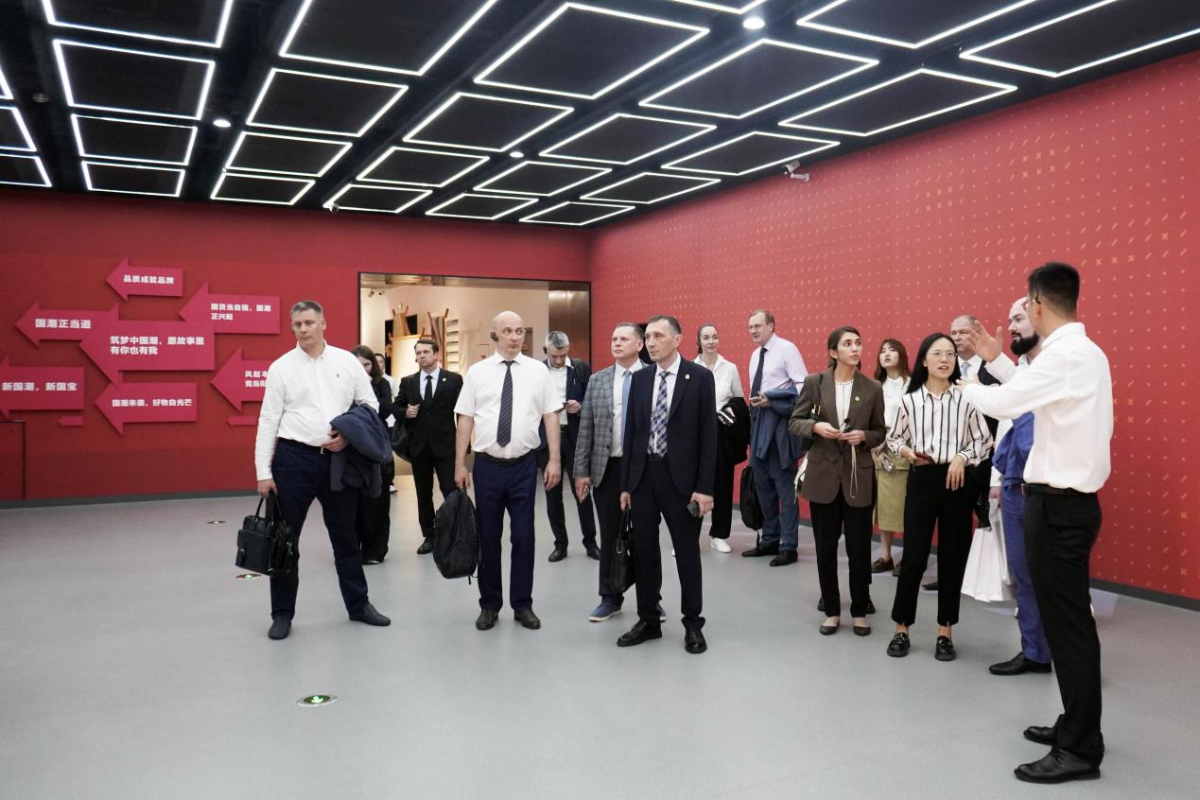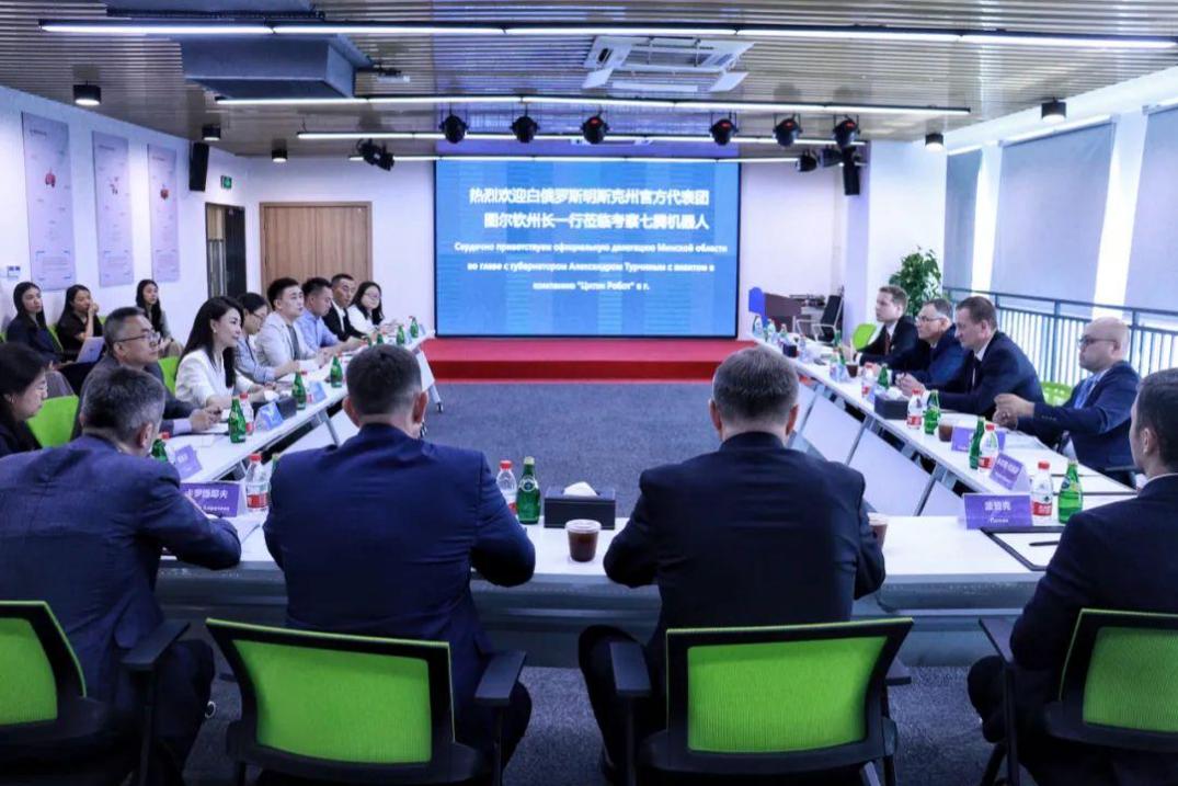 5 月 23 日,白俄罗斯共和国明斯克州州长图尔钦、白俄罗斯驻华大使馆代表、白俄罗斯驻重庆总领事馆代表、中白“巨石”工业园代表、重庆市商务委、重庆市外事办公室等相关负责人考察参观重庆七腾机器人有限公司,杨希老师担任现场交传。