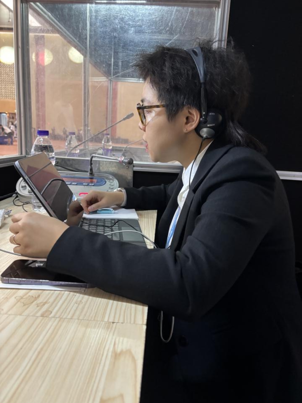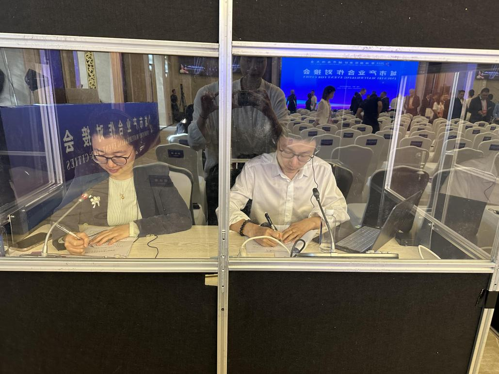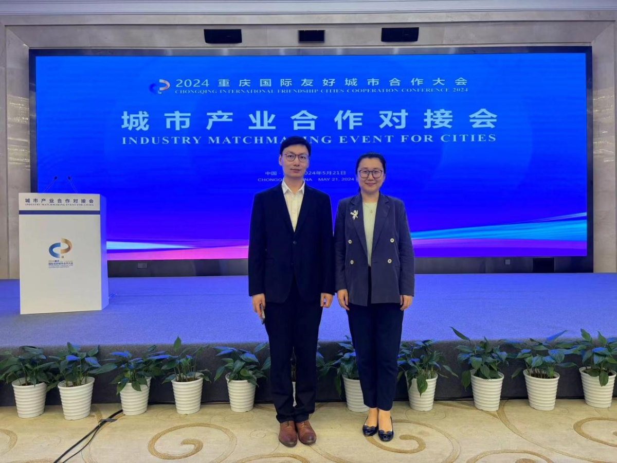 5月21日,2024重庆国际友好城市合作大会的重要活动之一——城市产业合作对接会在市外事大楼召开,来自全球27个国家的42个代表团积极参会。付景老师和胡业爽老师担任对接会同传翻译。