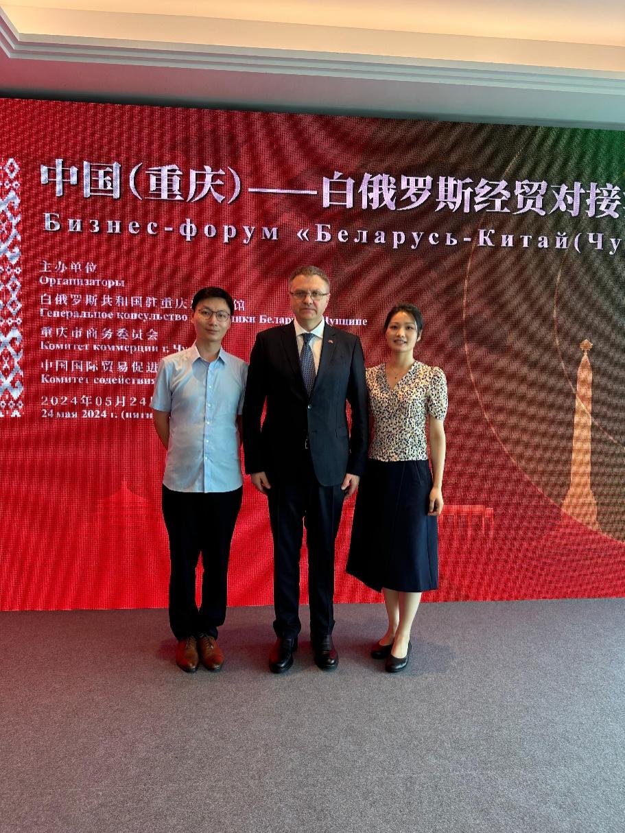 5月24日,白俄罗斯共和国驻重庆总领事馆、市商务委、市贸促会主办的中国(重庆)—白俄罗斯经贸对接洽谈会在渝中区环球金融中心举办,付景、李俊瑛两位老师担任洽谈会同声翻译。白俄罗斯驻华大使切尔维亚科夫对两位老师的工作给予高度评价并欣然合影留念。
