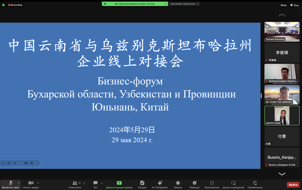 5月29日,云南省对外友好协会与乌兹别克斯坦布哈拉州投资工业贸易局联合举办两省州企业线上对接会。云南省商务厅、农业农村厅、文化和旅游厅、云南省投资促进局、乌兹别克斯坦布哈拉州投资局负责人及两地企业分别就农业、制药、旅游等领域开展了务实交流。付景、李俊瑛老师担任对接会双向交替翻译。