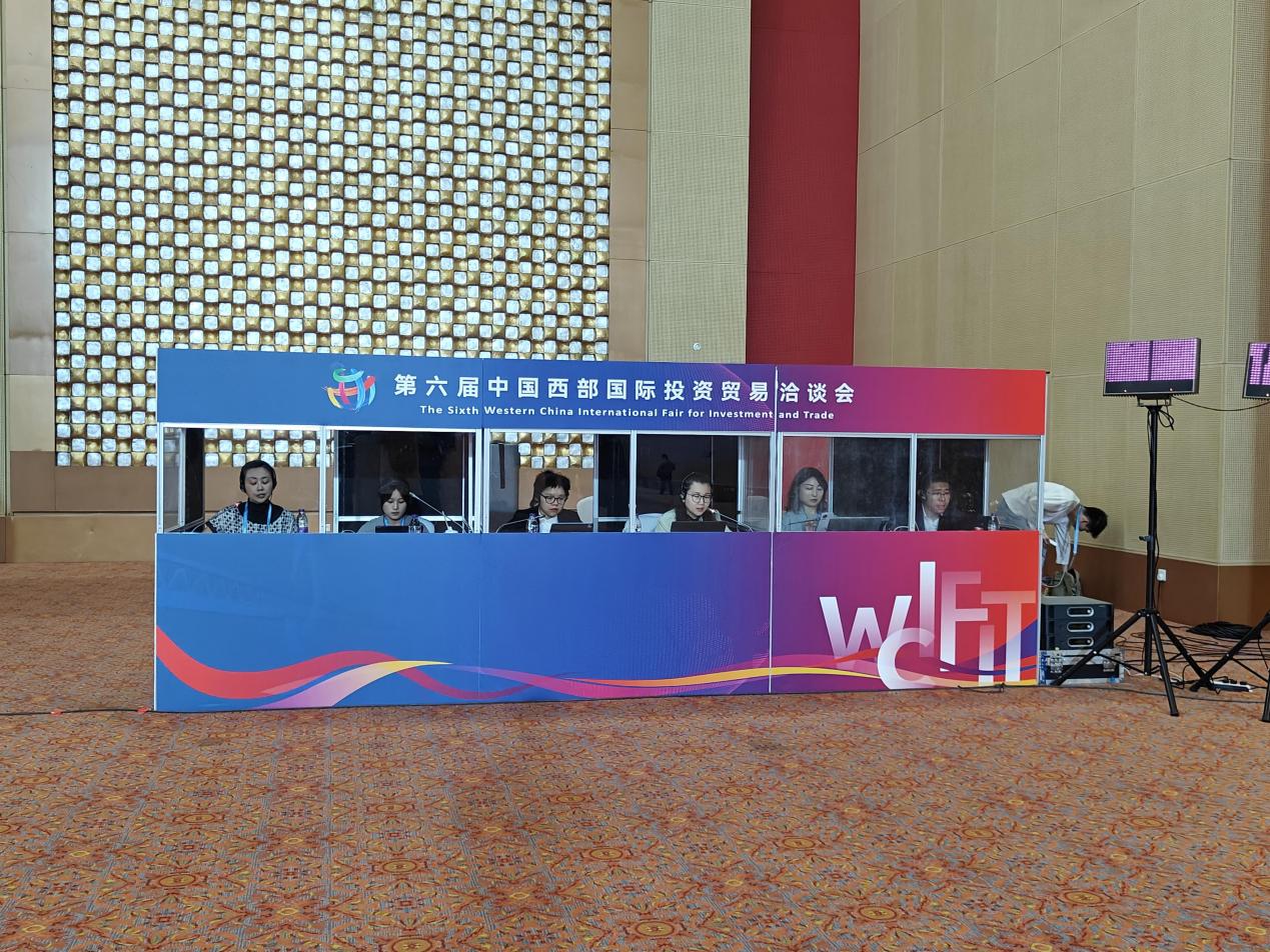5 月 23 日上午,第六届中国西部国际投资贸易洽谈会在渝开幕,胡业爽老师和吴多老师担任大会同传翻译。开幕式结束后,主宾国白俄罗斯国家馆开馆。白俄罗斯明斯克州执行委员会主席图尔钦、白俄罗斯驻华大使切尔维亚科夫,重庆市政府副市长张国智、商务部驻成都特派办副特派员邓德雄出席开馆仪式。吴多老师担任开馆仪式翻译。此外,重庆市市长为各国来宾举办了欢迎酒会,重庆市商务委宴请了白俄罗斯代表团,吴多老师承担了其中的翻译工作。