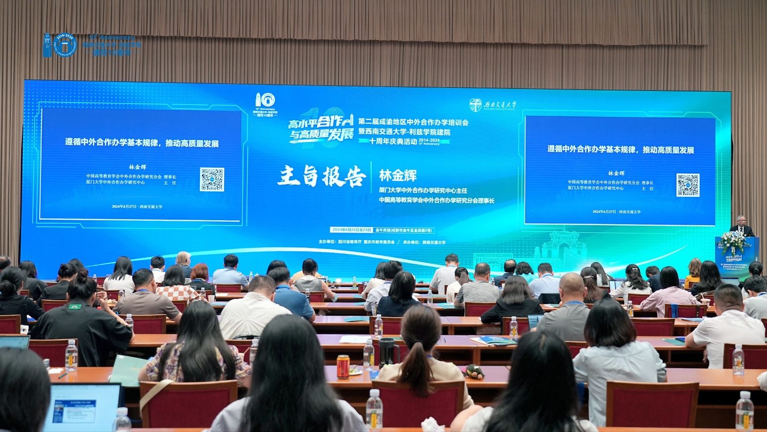 为深入学习贯彻习近平新时代中国特色社会主义思想和党的二十大精神,落实“推动成渝地区双城经济圈建设”国家战略,提升成渝地区高校中外合作办学质量,四川省教育厅、重庆市教育委员会主办、西南交通大学承办的“第二届成渝地区中外合作办学论坛”于 2024 年 6 月 26 日至 28 日在成都金牛宾馆举行,来自四川省和重庆市近200名中外合作办学有关高校国际处负责人、机构和项目相关学院领导及负责人员参加。