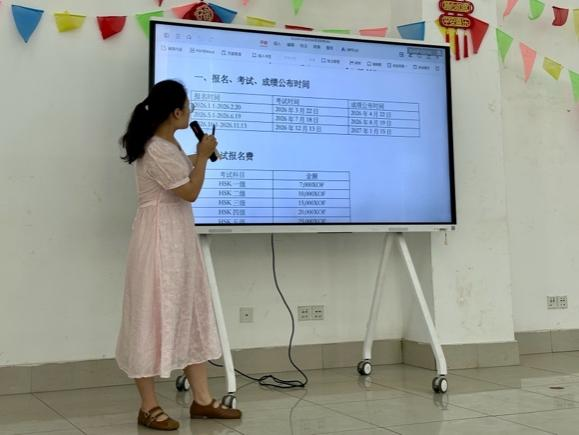公派教师刘荣介绍了HSK考试的报名时间、考试安排及相关费用,帮助学生清晰掌握考试信息。接着,对国际中文教师奖学金和“伟华铝业汉语英才奖学金”的资助对象及范围、申请条件及申请流程进行了系统讲解,重点梳理了从本科、硕士到一学年研修生的不同申请标准和重点环节,帮助学生明确准备方向,提高申请效率。
