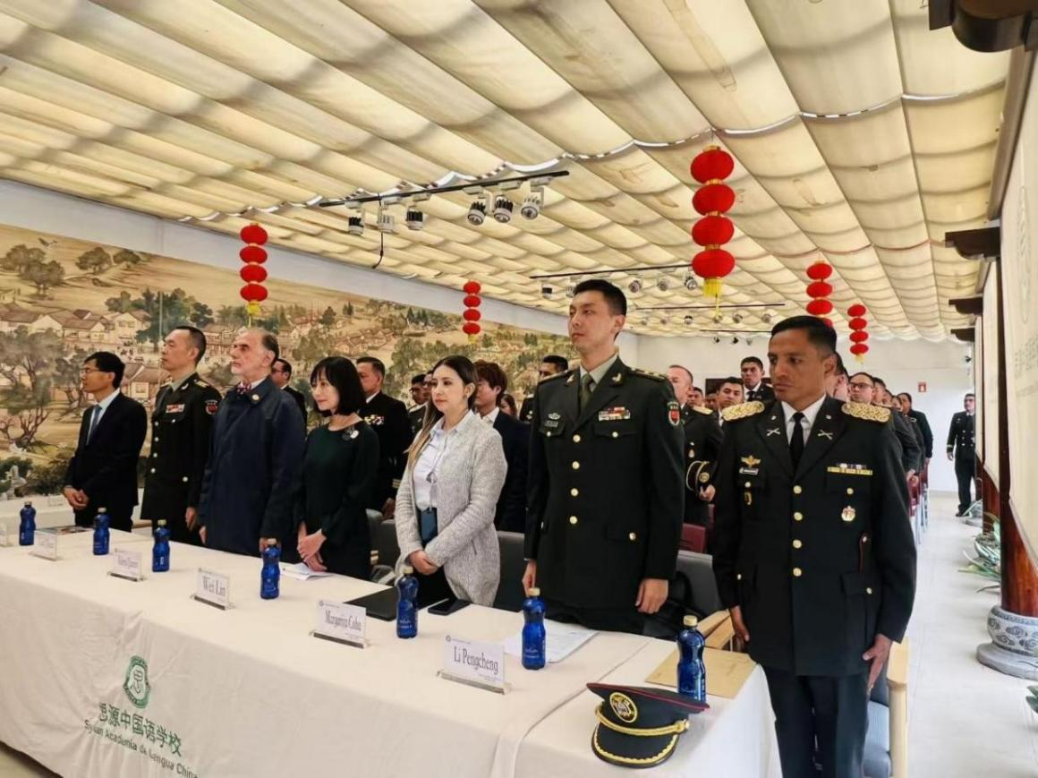 2025年9月1日上午10时,思源中国语学校孔子课堂内洋溢着热烈而庄重的气氛,厄瓜多尔军人首期中文培训课程开课仪式在此隆重举行。中国驻厄瓜多尔大使馆代办魏琳、中国驻厄瓜多尔大使馆国防武官大校刘义剑、厄瓜多尔国防部代理副防长兼机关事务副秘书Roberto Quintero 、厄瓜多尔国防部外事局局长Margarita Coba、思源中国语学校孔子课堂校长曹孝宏及参与培训的60名海陆空军人学员出席本次活动。