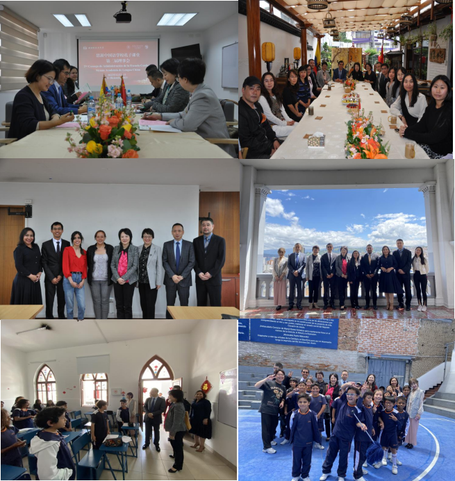 11—13日,川外访问团首站到达厄瓜多尔基多,在思源中国语学校孔子课堂召开了第二届理事会,会中与思源孔子课堂校长曹孝宏、教务主任张艳等就本土及志愿者教师培训、夏令营课程、拓展国际中文教育广深度、实习基地建设等事宜开展了深入研讨。访问团参观了孔子课堂的汉语教学工作坊,走访了孔子课堂的教学点Matovelle学校,与本部公派教师和志愿者举行了座谈。就厄瓜多尔的中文教学基本情况、教材和教学法特点、教学点的建设、文化活动开展、中文+职业教育教学及学校与当地企业的培训合作等各抒己见,各显智慧。此外,访问团还走访了厄瓜多尔教育部,拜会教育部副国务秘书长Karina Rivadeneira和基础教育处负责人Camila Jurado,双方就基础教育阶段国际中文教育的合作和留学生招生事宜等进行了探讨和交流。