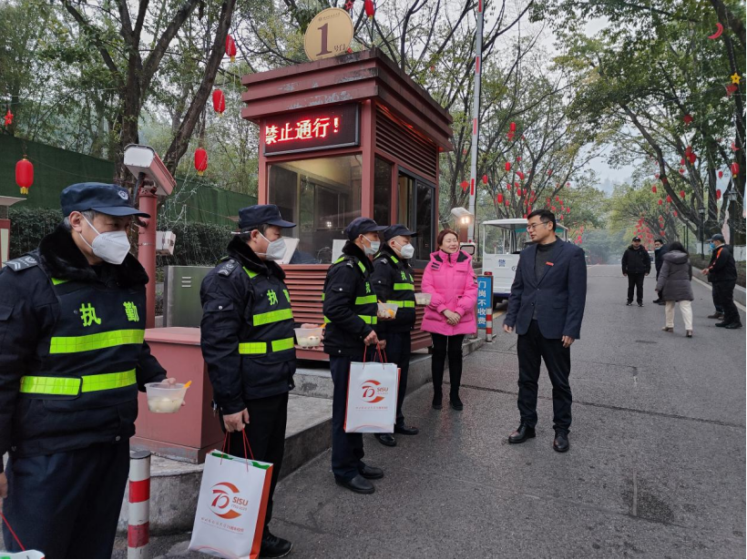邹渝一行前往学校各门岗、保卫处监控值班室、校医院、行政楼值班室、快乐食间、社区等亲切慰问在假期中坚守岗位人员。每到一处,邹渝向大家送上慰问品,与大家亲切交谈。
